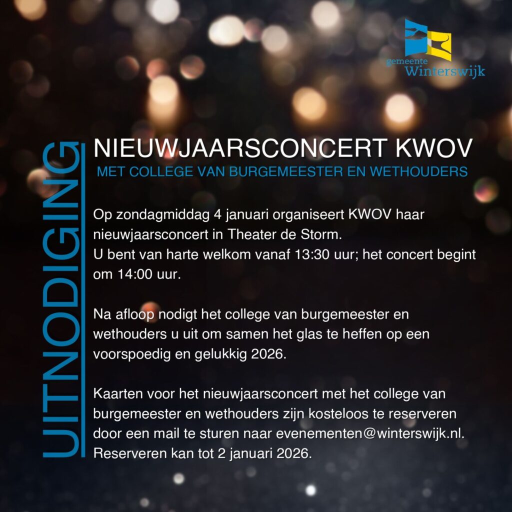 Traditiegetrouw verzorgt het harmonie- & symfonieorkest en de slagwerkgroep van de Koninklijke Winterswijksche Orkest Vereeniging (KWOV) weer een niewjaarsconcert. De leden uit Winterswijk en omstreken zullen je verrassen met een afwisselend repertoire. Dit wordt een heerlijke muzikale start van het nieuwe jaar!